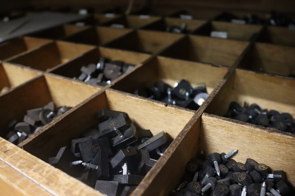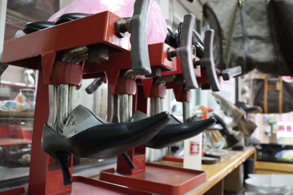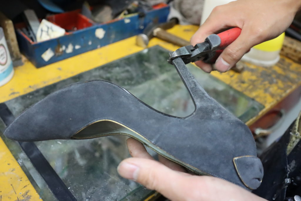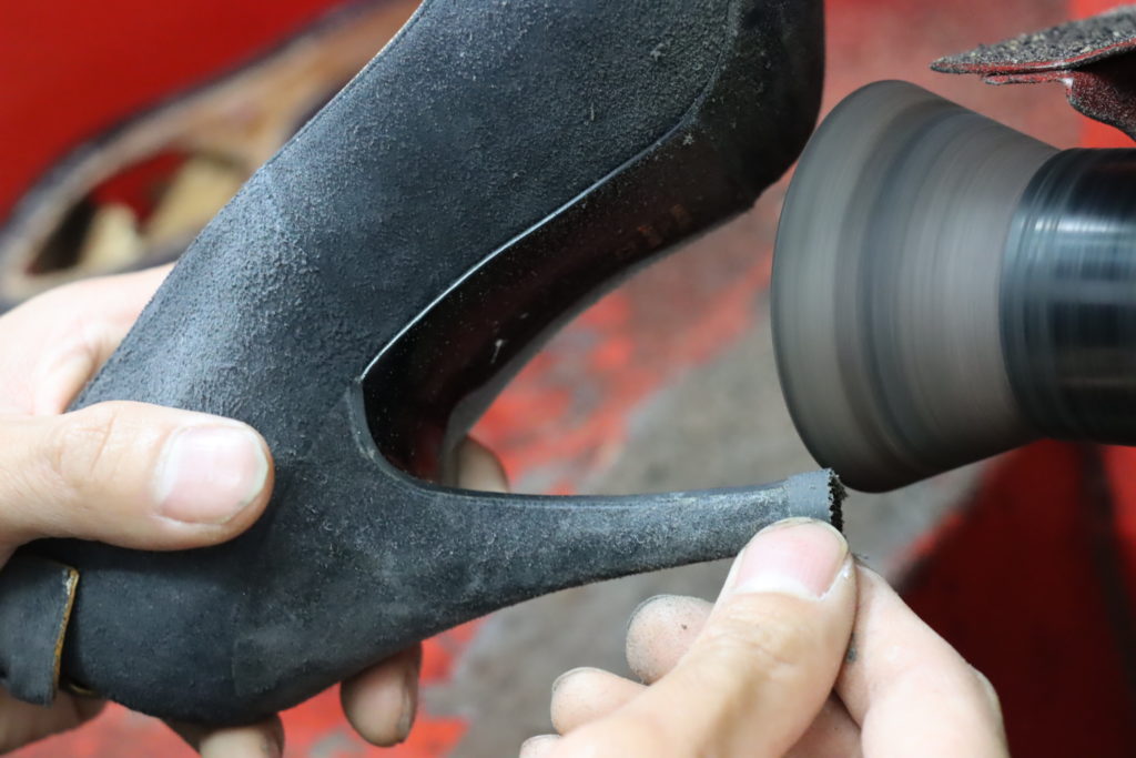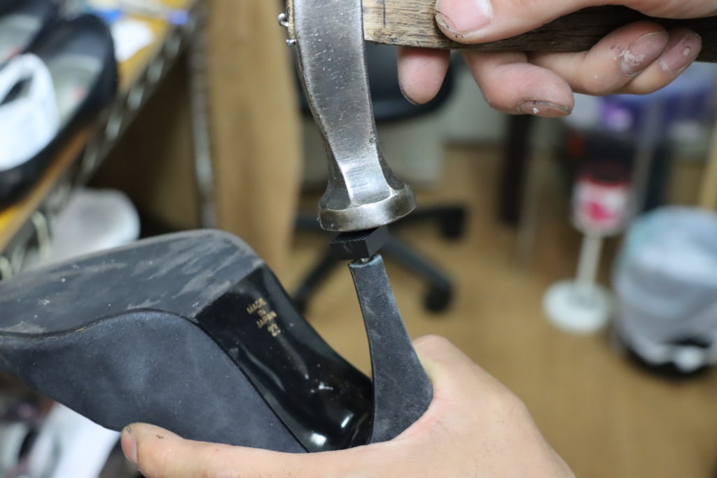 女性のお客さまからの修理依頼で最も多い、ピンヒールのかかとゴム交換。実際に作業している様子を少し見せていただきました。