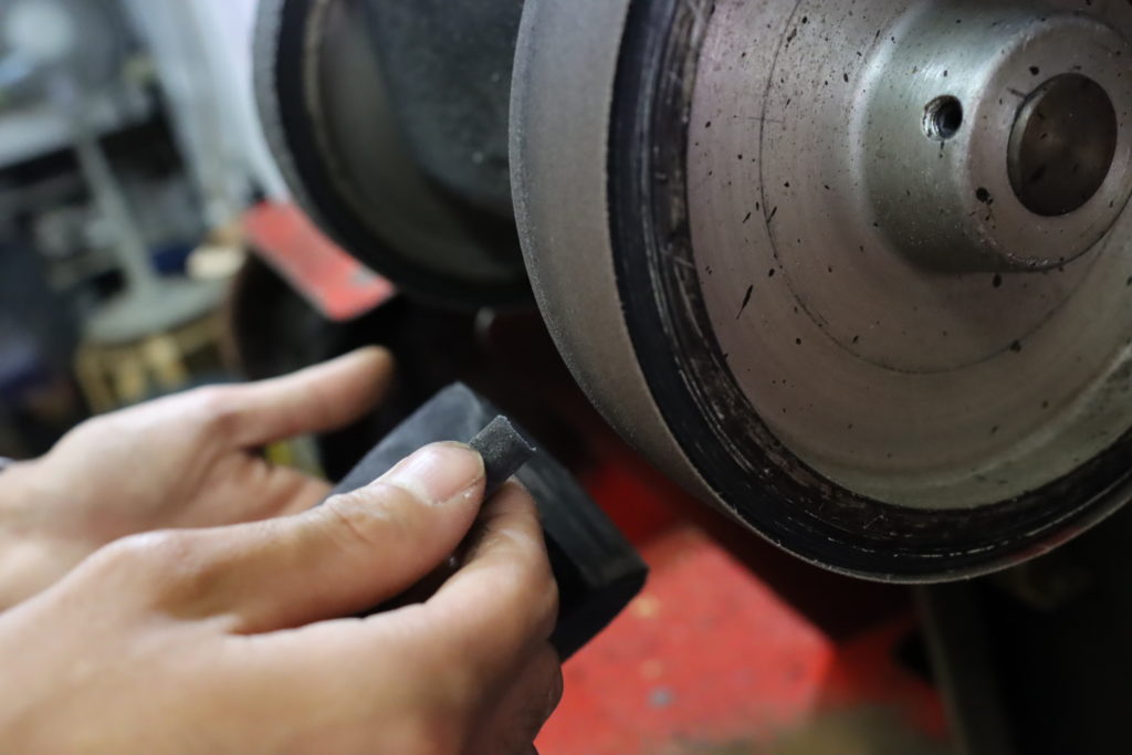 研磨紙を回転させて研磨する「グラインダ」という機械を使用して、ゴム部分の形を整えていきます。