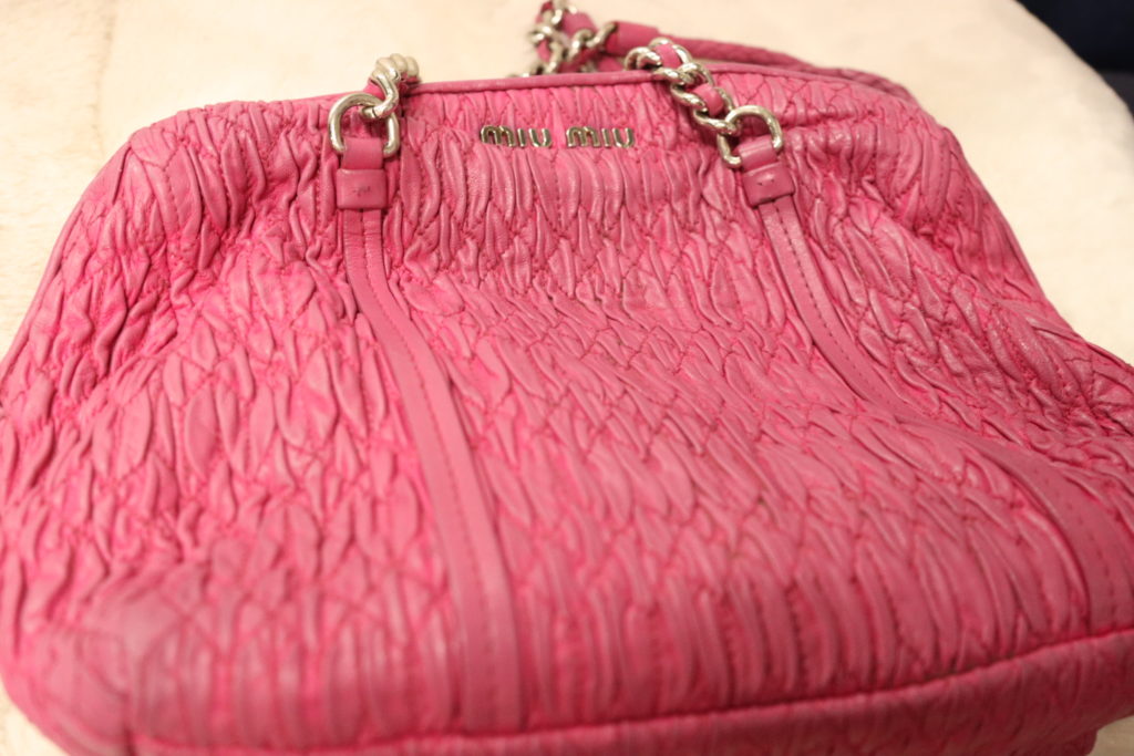 バッグの状態を診てもらうと、バッグの表裏に付着しているカビを取るための洗浄と、全体的に色あせているピンクのカラーを補色が必要とのこと。