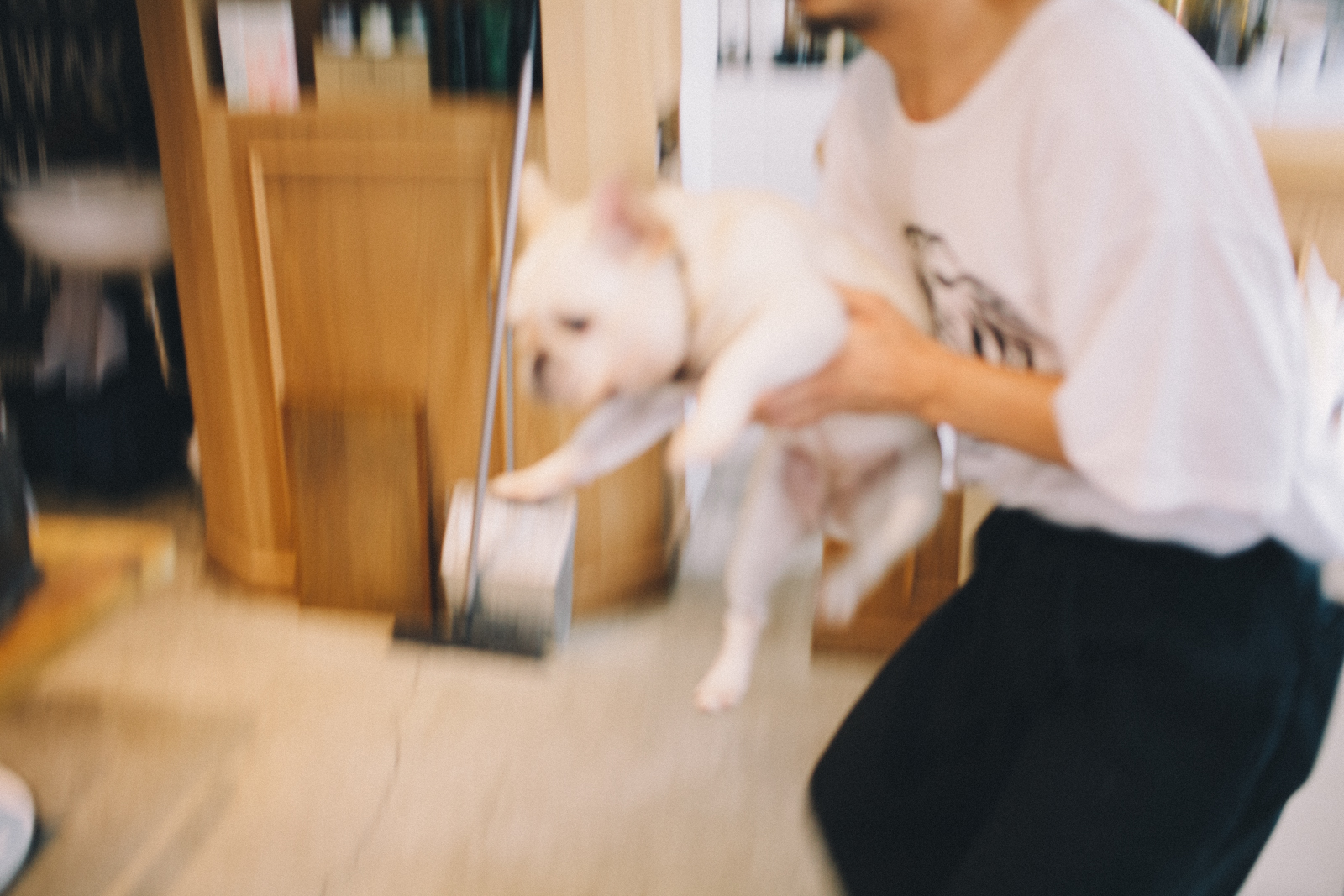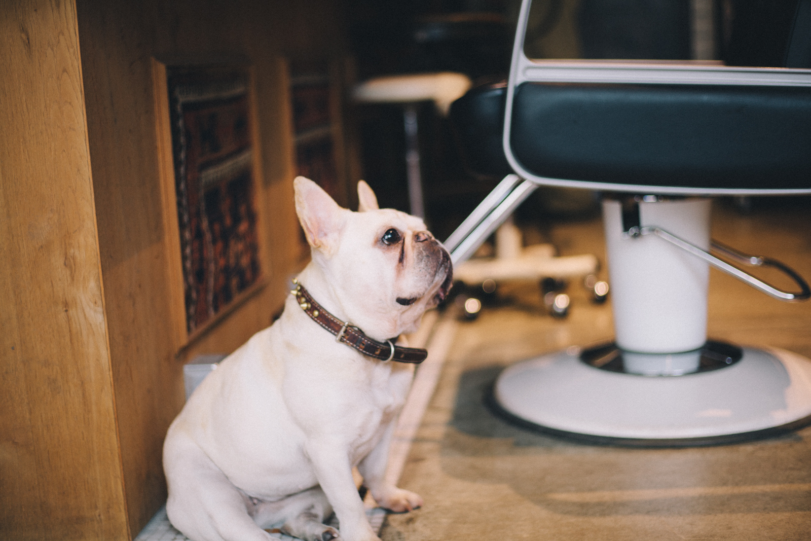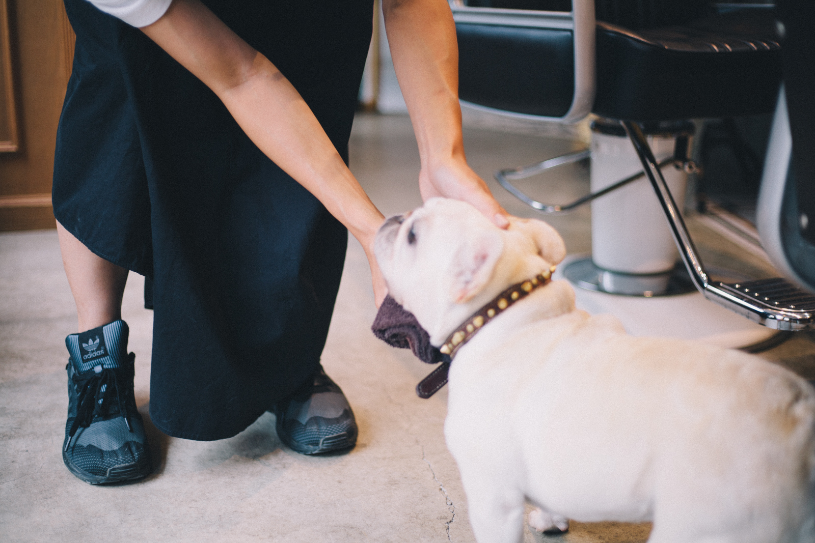 サロンがオープンしたのは、2013年の10月。ナティーとオーナーご夫妻が出会ったのは、さらに前のおよそ9年前。それぞれ原宿のサロンで働いていたころ、奥さんが勤めていたお店では5匹フレンチブルドッグを飼っていて、そのなかの1匹だったそうです。はじめ、ナティーの世話は別の男性スタッフが行っていたところ、1歳になるタイミングで奥さんがお世話係に。そこからずっと、仕事場でもお家でも毎日一緒に過ごしています。