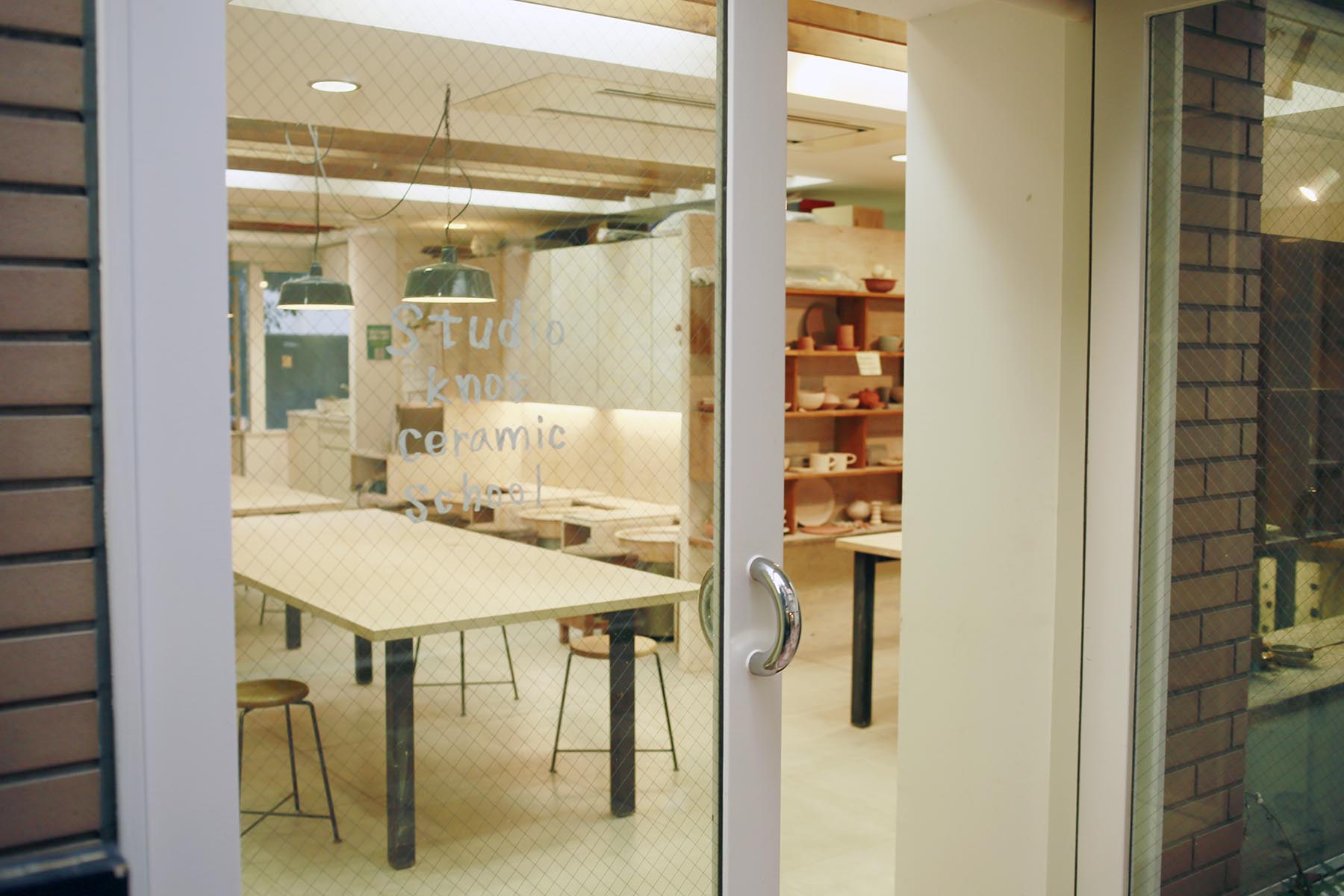 商店街の通りから、足を踏み入れてマンションの中庭に入ると、ようやく教室の玄関がお目見え。ガラス張りの玄関からは、温かみのあるライトや、棚に飾られたうつわが見え、開放的で入りやすい雰囲気です。