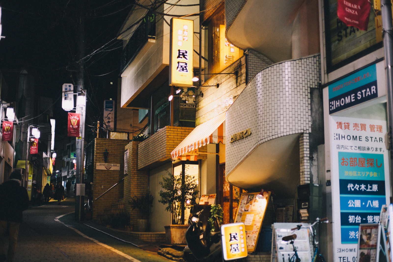 代々木上原駅東口から歩いてすぐ、和田明日香さんの街歩き記事でご紹介いただいた花屋さん「mugihana」の真向かいの建物2階に「民屋」はあります。オレンジの看板が目印です。