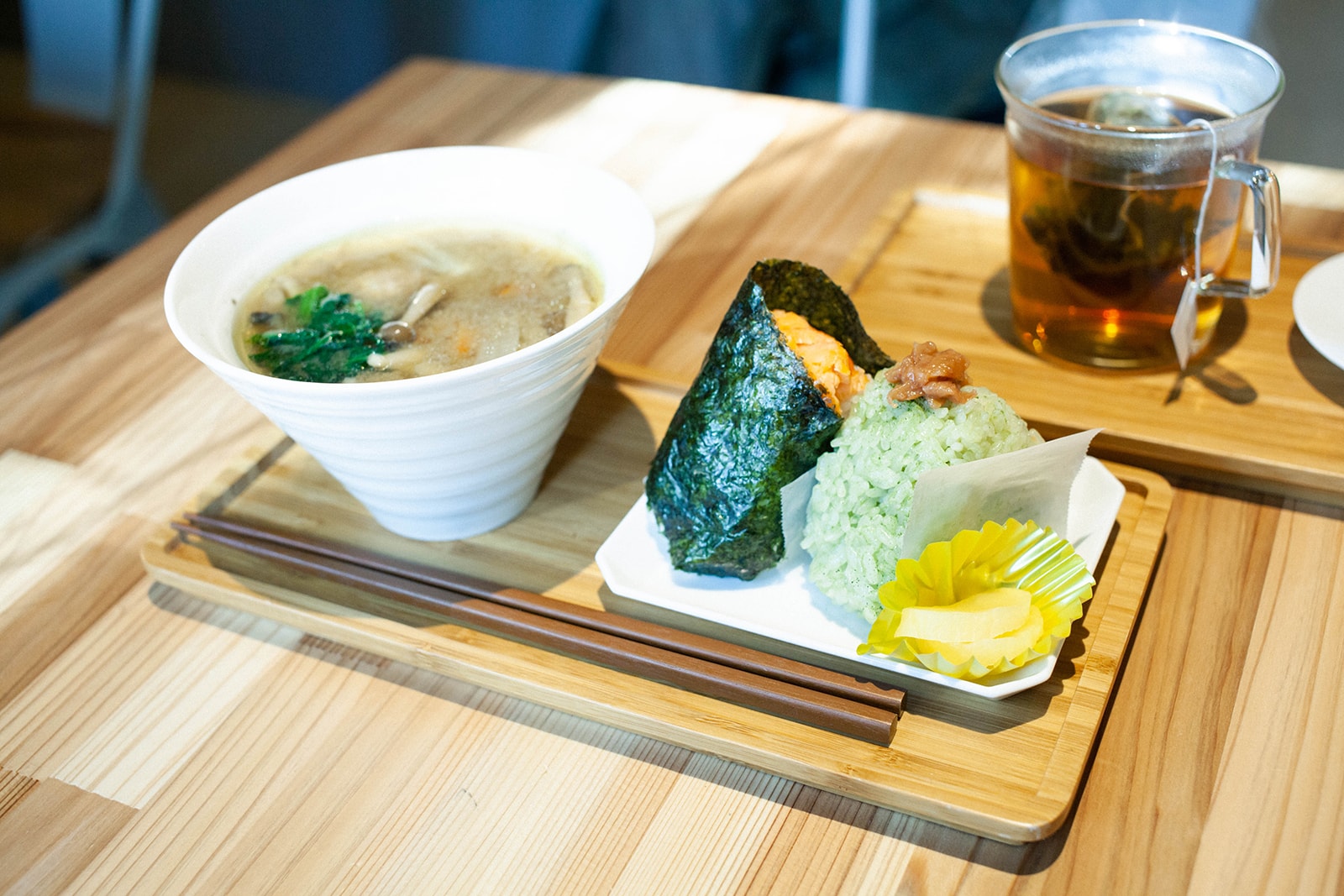 東京和茶房では、12:00からお茶づくしのランチセットがいただけます。おにぎりには煎茶が入っており、肉団子の豚汁にはなんとほうじ茶が使われています。