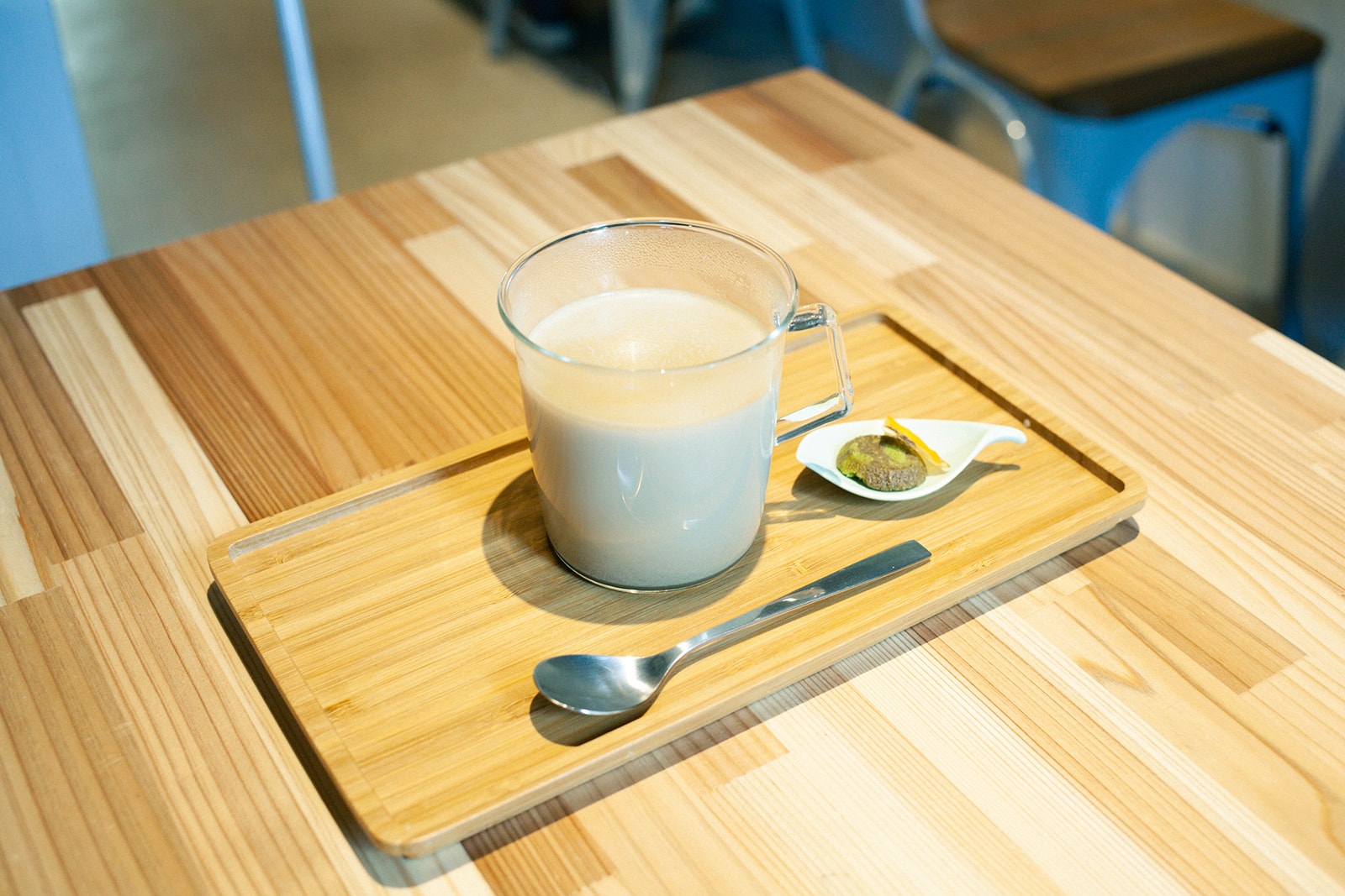 そしてお店の一番人気がほうじ茶ラテ。店内でいただくときはガラスのカップに入っていて、見た目はまさにカフェラテのよう。写真ではお伝えできないのが残念なのですが、今ここではお茶の芳しい香りが立ち上っています!