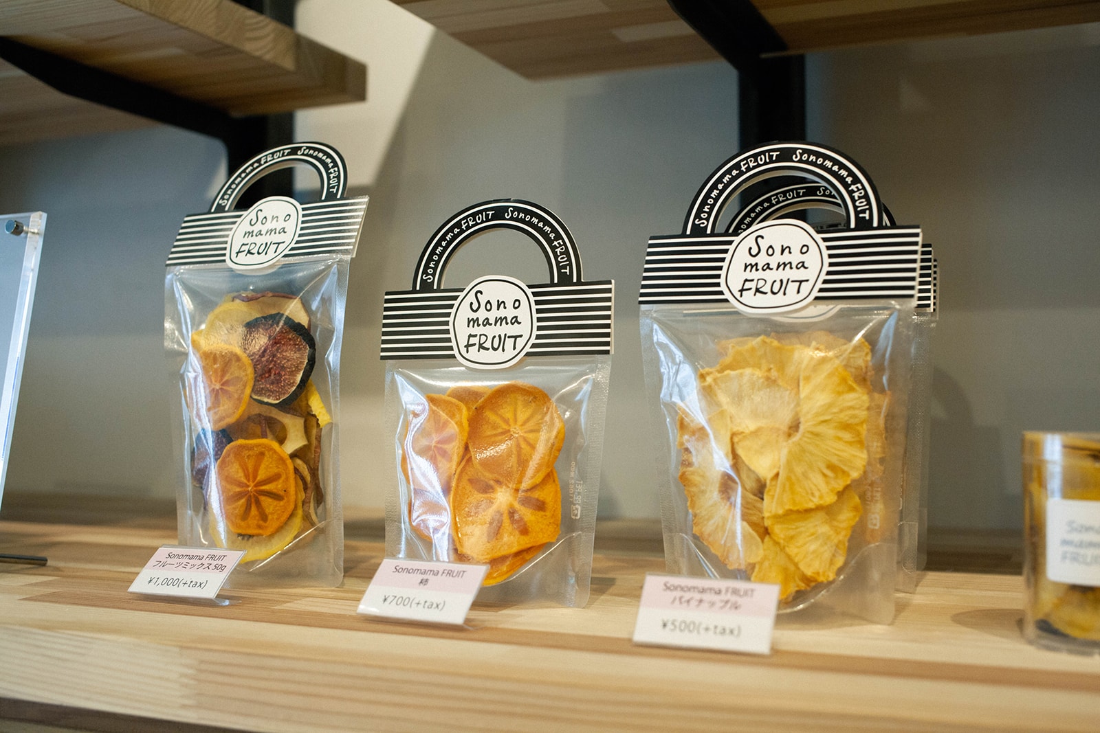 先ほどほうじ茶ラテと一緒にいただいたドライフルーツは「sono mama FRUIT」のもの。ノンフライ、ノンシュガー、無添加なのに色鮮やかで甘い。お茶に浮かべて数分待ち、フルーツティーのように飲むのも美味しいそうです。