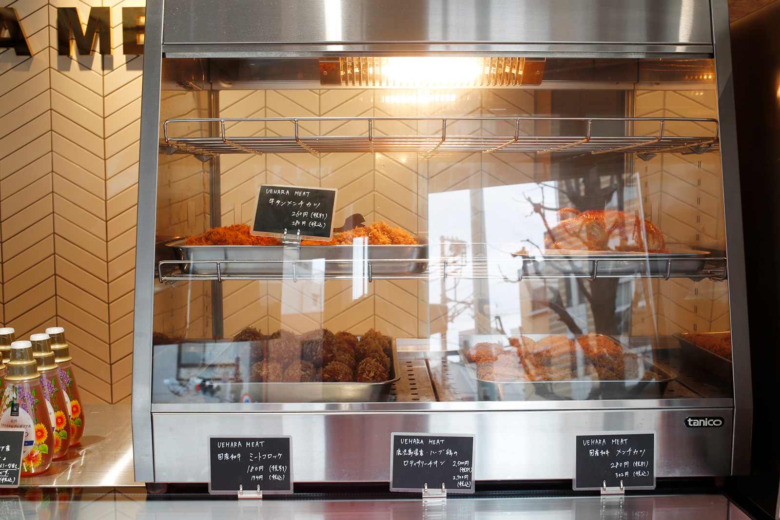 店のカウンターの右手には、毎日お店で手作りされるメンチカツやコロッケなどのお惣菜が並んでいます。一羽丸ごと調理された迫力満点のロティサリーチキンなどもあり、眺めているだけで心躍るラインナップ!