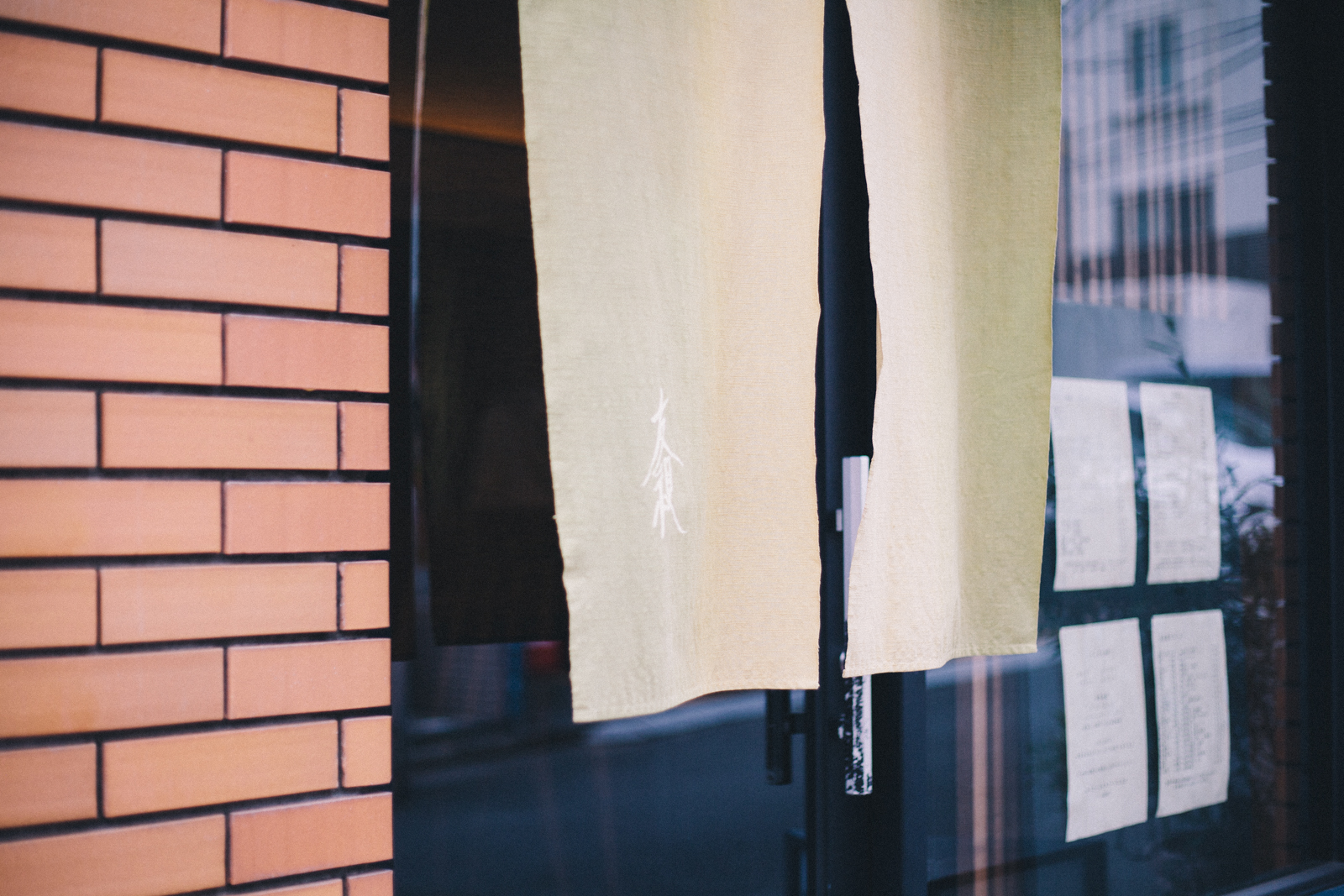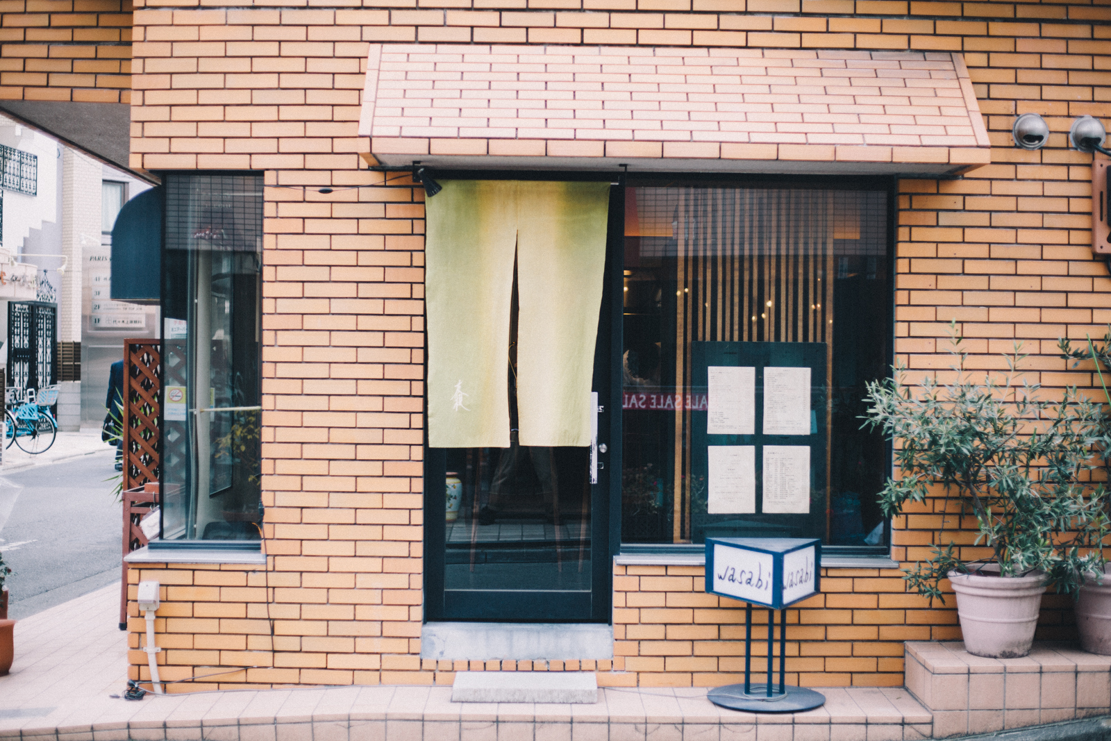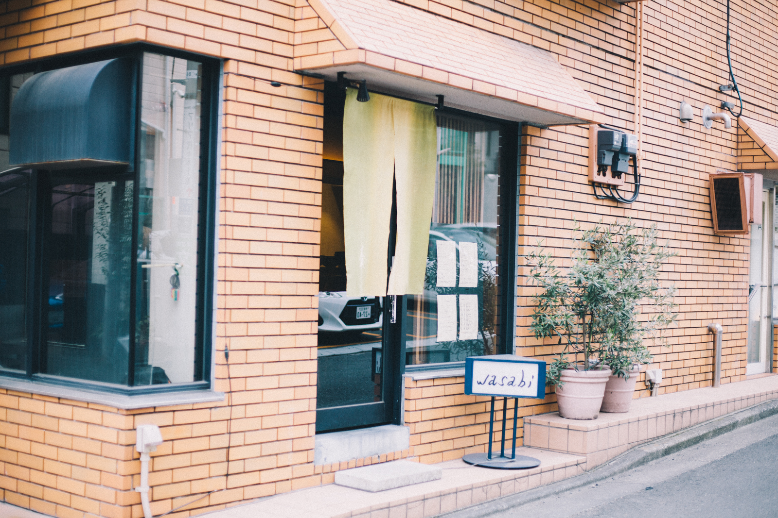 代々木上原駅前通りから、住宅街方面に向かい1本入ったところに「wasabi」はあります。店名の通り、山葵色の暖簾が目印です。
