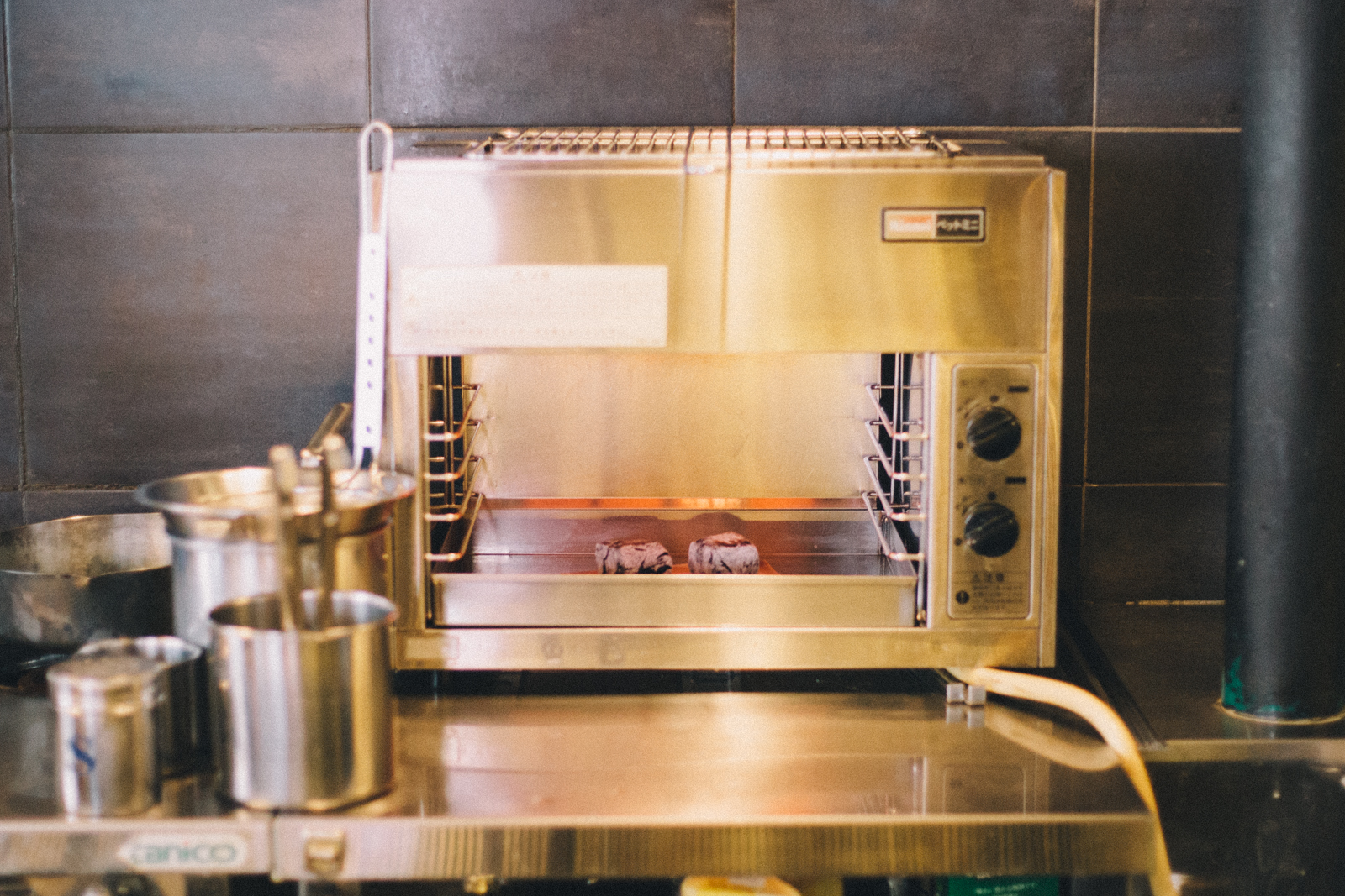 「外側を焼いたあとは、中心温度を65℃に保ちつつ、予熱で熱を入れていきます。お肉の中の水分が逃げないよう回転させて、旨味を閉じ込めます。いわゆるローストの技法で、通常は数十分かかるお店もありますが、ここではオーダーいただいて15分くらいで提供できるような焼き方をしています」