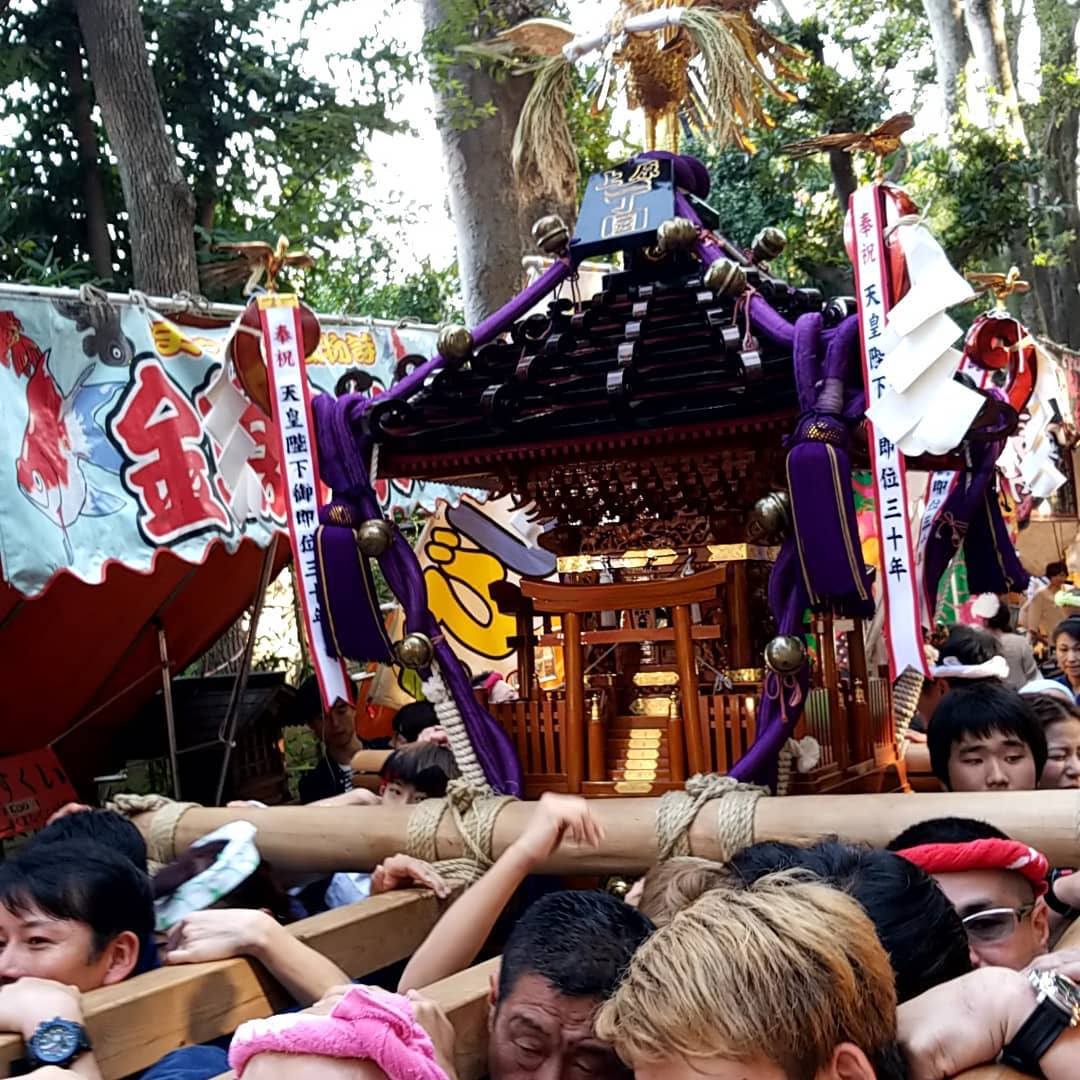 通常の代々木八幡宮例大祭では各地域の睦からお神輿が出るのですが、2018年は天皇在位30年を記念して「宮みこし」が渡御されました。