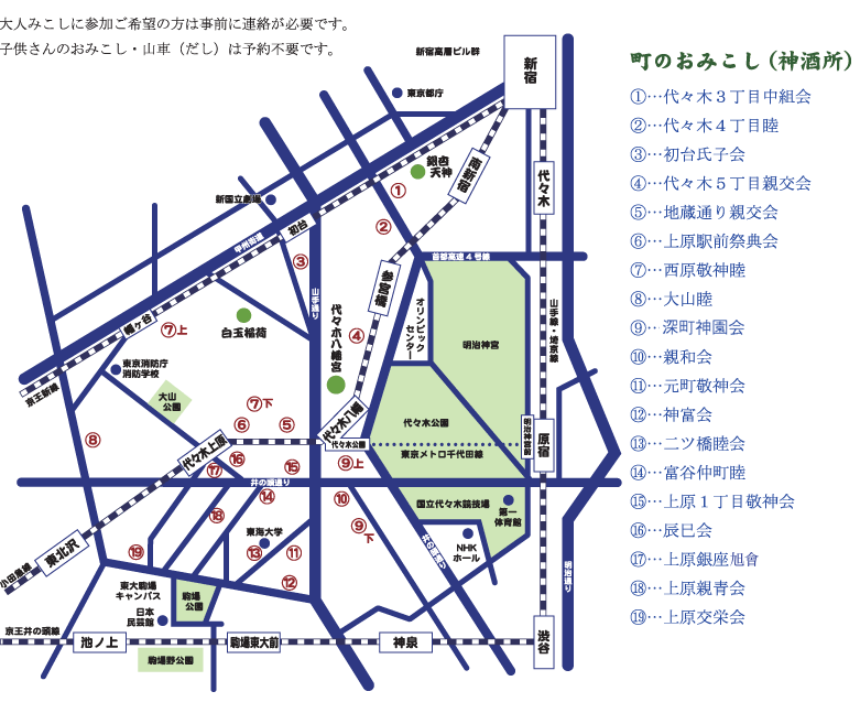 2025年 代々木八幡宮例大祭のおみこしマップは以下の通り。