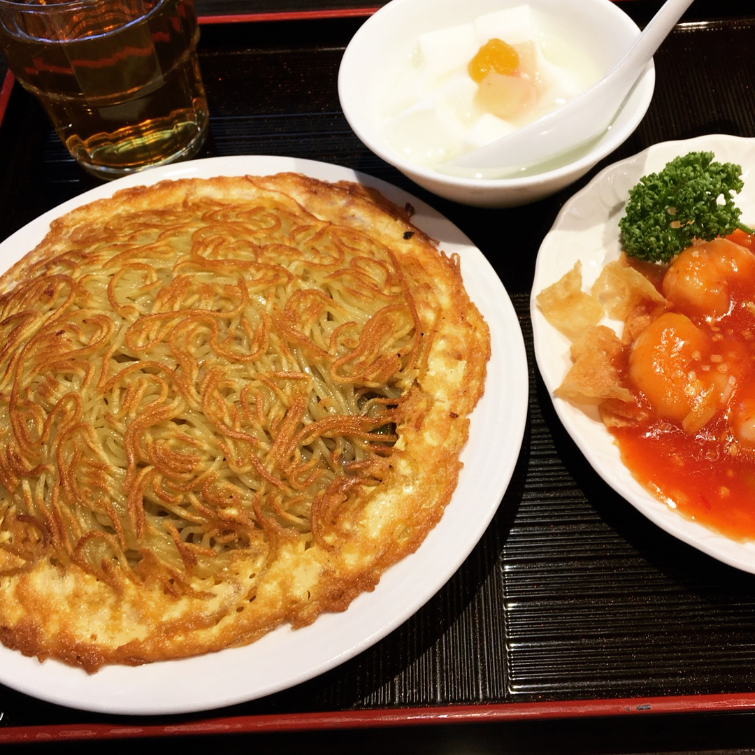 看板メニューの「梅蘭焼きそば」は、野菜や豚肉にたっぷりの餡をかけ、その上にカリカリに焼いた中華麺を乗せたもので、横浜中華街の名物となっている逸品です。