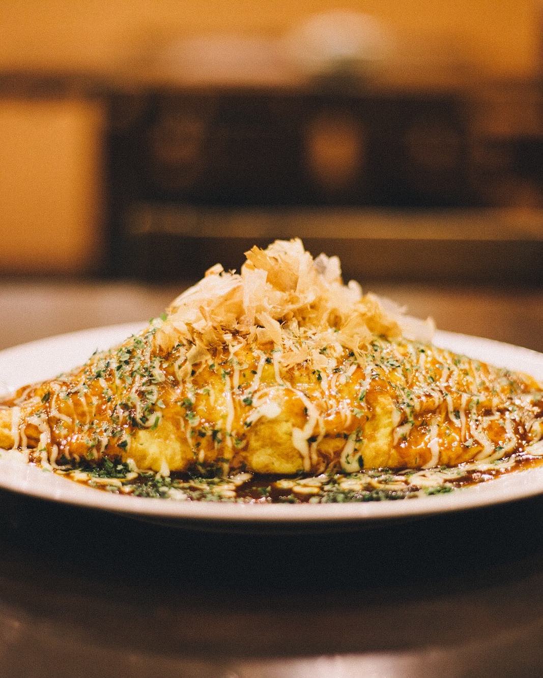 豚肉とキャベツ、揚げ玉、チーズを卵で包み、ソースとマヨネーズをかけただけ、というシンプルなメニューですが、リピーターが欠かさず注文するという一品です。