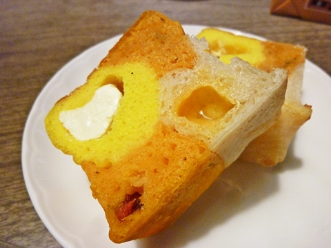 パッと目を惹く「タイルパン」は、トマトベース、かぼちゃベース、フォカッチャの3種類の生地を繋ぎ合わせた見た目にも楽しいパン。