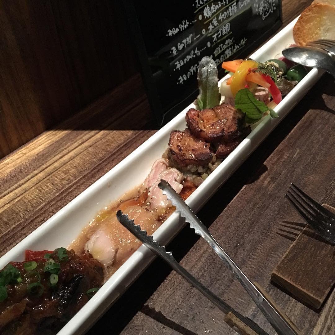 長いお皿に、1口大に盛られた料理がずらっと並びます。
