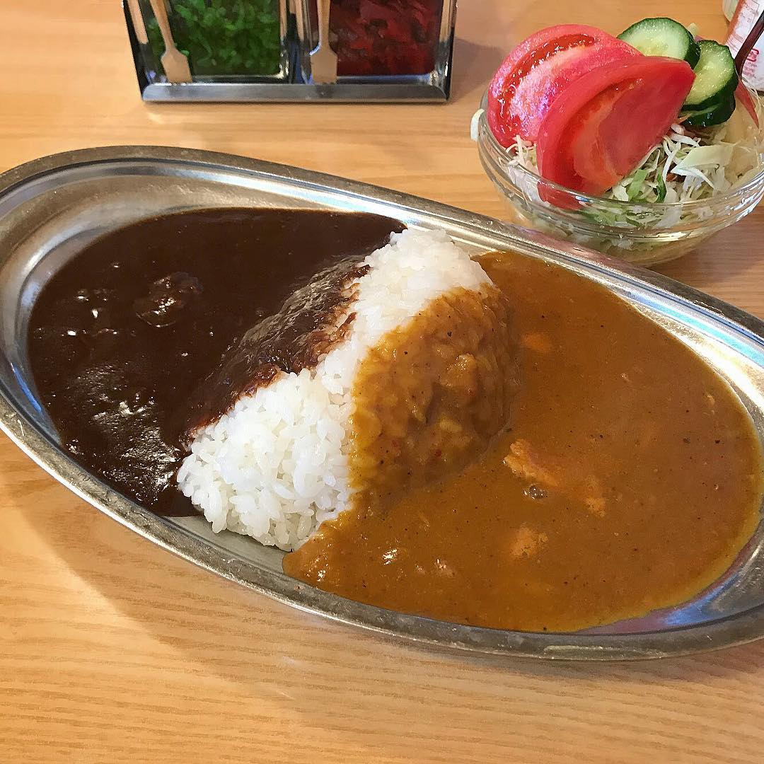 カレー皿の真ん中にご飯の山を作り、左右に好みのカレーを半分ずつかけてくれるんです。