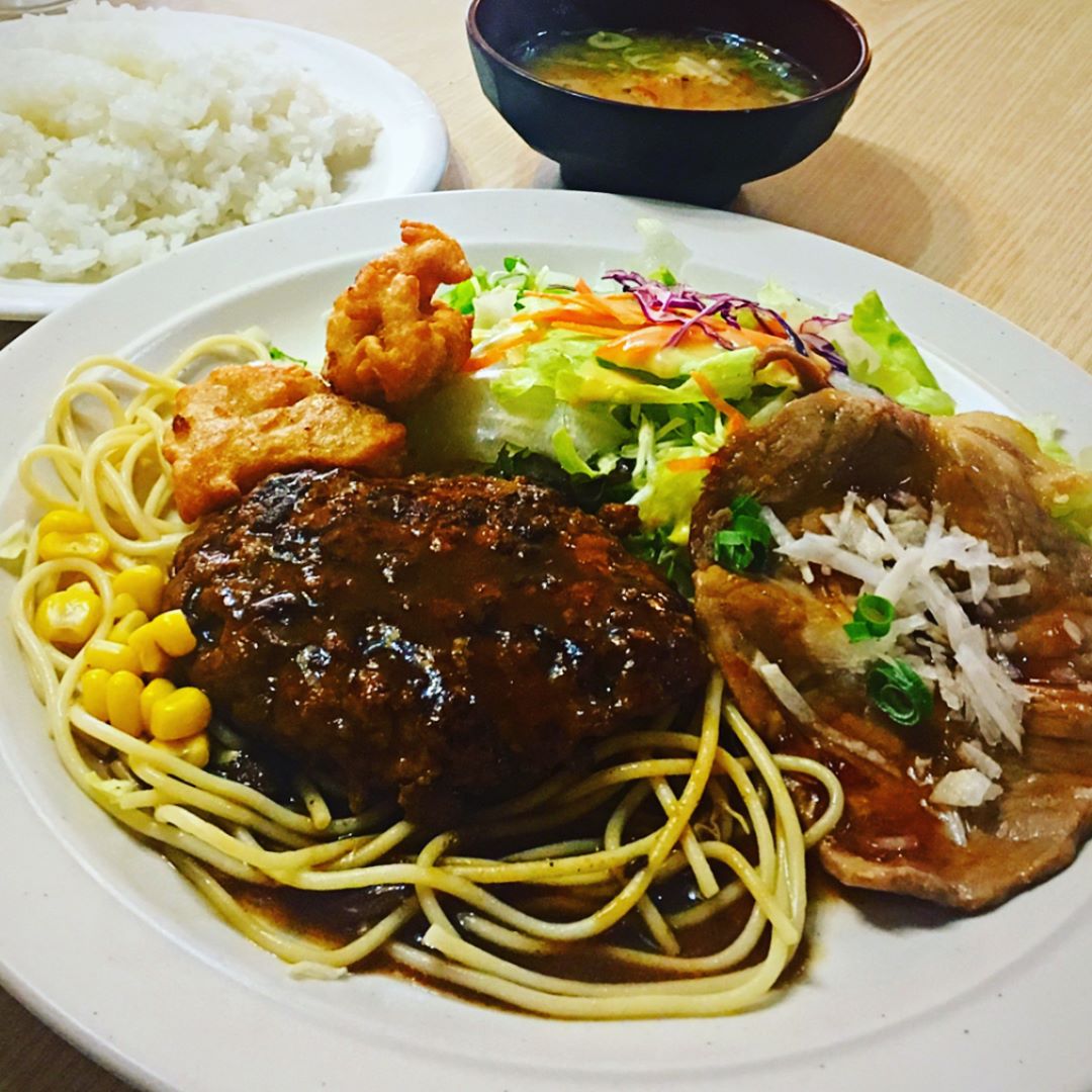 男メシにぴったりな「全部のせセット」は、ハンバーグにカニクリームコロッケ、魚フライ、生姜焼き、メンチカツまで付いて、なんと1,000円!