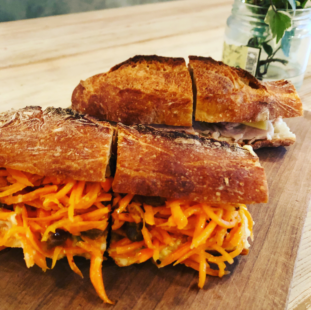 3種類あるこだわりのバゲットから土台を選び、キャロットラペやサーモンを挟んでもらえばランチにもぴったりですよ!